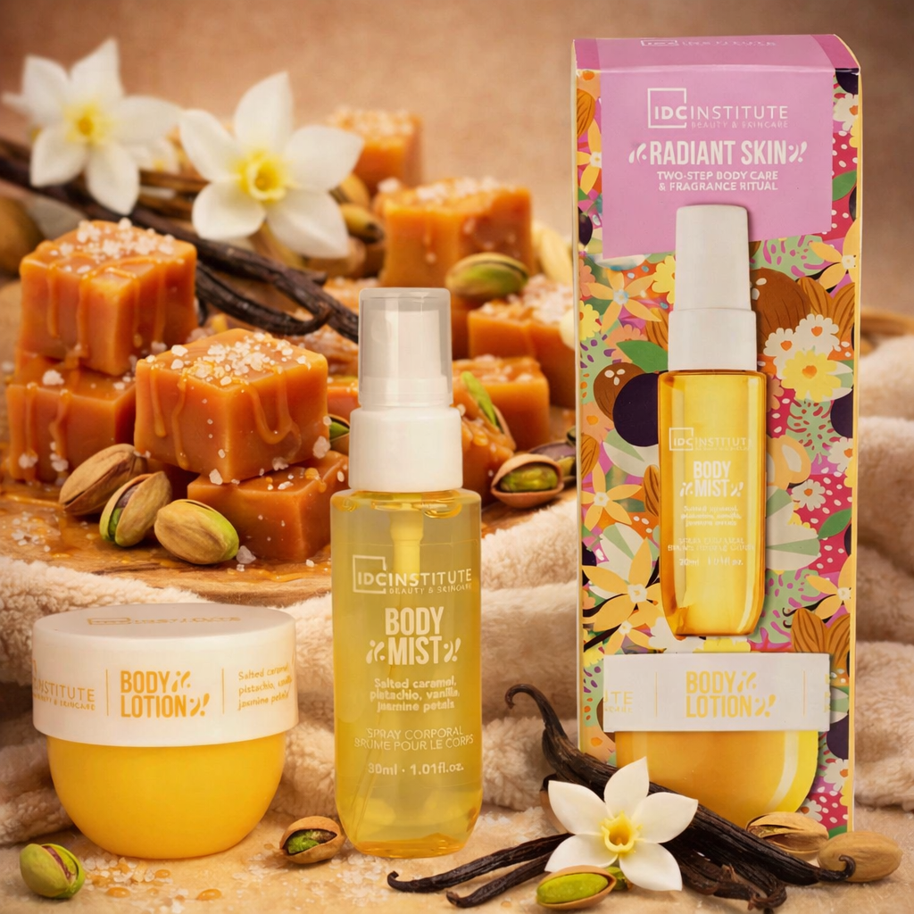 Le coftret Radiant Bright Duo combine une brume corporelle de 30 ml et une crème pour le corps de 50 ml pour choyer la peau et ravir les sens. Son parfum s'ouvre sur des notes sucrées de pistache grillée et de caramel salé, enveloppées dans un cœur de vanille crémeuse et une base chaude et addictive. La crème hydrate en profondeur et laisse un fini éclatant, tandis que la brume corporelle rafraîchit et rehausse le parfum à tout moment de la journée.